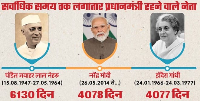 प्रधानमंत्री मोदी शुक्रवार को अपने कार्यकाल के 4078 दिन पूरे कर लेंगे। इंदिरा गांधी 24 जनवरी, 1966 से 24 मार्च, 1977 तक लगातार 4077 दिन प्रधानमंत्री रही थीं। अगर राज्य और केंद्र में सरकार का नेतृत्व करने की बात करें तो नरेंद्र मोदी का सभी प्रधानमंत्रियों के बीच एक रिकॉर्ड है। वह गुजरात के मुख्यमंत्री और प्रधानमंत्री के रूप में 24 वर्षों तक सरकार का नेतृत्व कर चुके हैं।