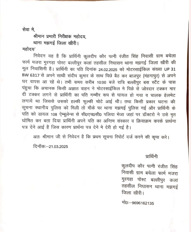 लखीमपुर खीरी – जनपद लखीमपुर खीरी तहसील निघासन क्षेत्र थाना मझगईं निवासी रंजीत सिंह अपनी मोटरसाईकिल से 24/02/2025 दिनांक को बाजपुर (महंगापुर) से अपने घर वापस आ रहे थे। की तभी अज्ञात वाहन ने रात्रि 10:00 बजे बल्लीपुर बस स्टैंड के पास रंजीत सिंह के बाइक को जोरदार टक्कर मारी जिससे बाइक सवार को गंभीर चोट आई और पीछे बैठी रंजीत सिंह की पत्नी कुलदीप कौर को हल्की चोटें आई जिसके बाद कुलदीप कौर ने 108 एम्बुलेंस से सी० एच० सी० पलिया भेजा जहां डॉक्टरों ने मृत घोषित कर दिया। कुलदीप कौर अपने पति का अंतिम संस्कार व क्रियाक्रम करके प्राथना पत्र देने में देरी हो गई है।