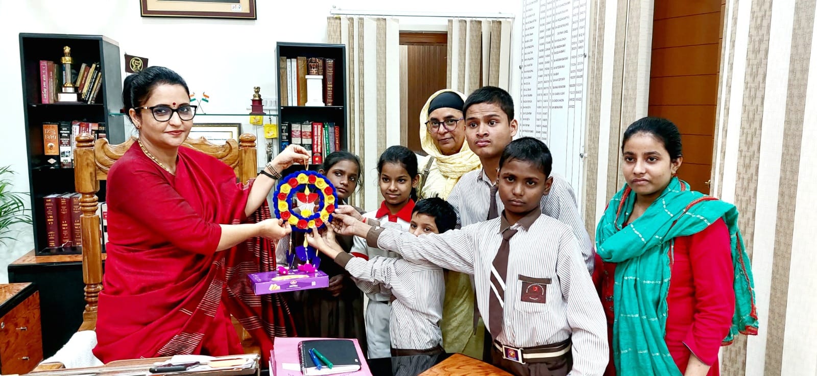 बहराइच । बाबा सुन्दर सिंह बधिर विद्यालय के दिव्यांग बच्चों कक्षा 10 के प्रान्शू गुप्ता, कक्षा 1 की आयुषी मिश्रा, एलकेजी की अर्चना चौहान व विक्की तथा नर्सरी की जैसिनी ने विद्यालय की प्रबन्धक डॉ. बलमीत कौर व विशेष शिक्षिका सोनी के साथ कलेक्ट्रेट पहुंच कर जिलाधिकारी मोनिका रानी से भेंट कर उन्हें विद्यालय के दिव्यांग छात्रों द्वारा दीपावली के लिए तैयार किया गया शुभकामना स्मृति चिन्ह भेंट कर बधाई दी। डीएम मोनिका रानी ने पूरी आत्मीयता के साथ दिव्यांग छात्रों से भेंट कर उन्हें मिठाई खिलाते हुए वादा किया कि वे शीघ्र ही विद्यालय आकर बच्चों से भेंट करेंगी।