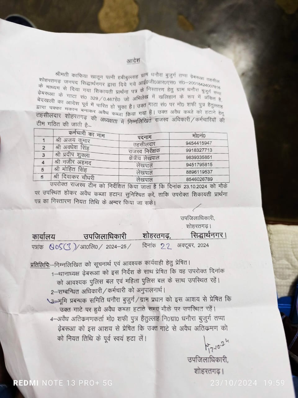 जिसमें लिखा गया है कि श्रीमती काफिया खातून पत्नी हबीबुल्लाह ग्राम धनौरा बुजुर्ग तहसील शोहरतगढ़ जनपद सिद्धार्थनगर द्वारा आई०जी०आर०एस०-200182400781 के माध्यम से दिया गया शिकायती प्रार्थना पत्र के निस्तारण हेतु ग्राम धनौरा बुजुर्ग तप्पा डेबरूआ के गाटा सं० 329/0.467हे0 जो अभिलेख में खलिहान के रूप में अंकित है. बेदखली का आदेश पूर्व में पारित हो चुका है। उक्त गाटा सं० पर मो० शफी पुत्र हैतुल्लाह द्वारा पक्का मकान बनाकर अवैध कब्जा किया गया है। उक्त अवैध कब्जे को हटाने हेतु तहसीलदार शोहरतगढ़ की अध्यक्षता में निम्नलिखिते राजस्व अधिकारी/कर्मचारियों टीम गठित की जाती है- जिसमें अजय कुमार,तहसीलदार, अवधेश सिंह राजस्व निरीक्षक, क्षेत्रीय लेखपाल प्रदीप शुक्ला,नजीर अहमद ,मोहित सिंह ,दिवाकर चौधरी उपरोक्त राजस्व टीम को निर्देशित किया जाता है कि मौके पर उपस्थित होकर अवैध कब्जा हटाना सुनिश्चित करें, ताकि उपरोक्त शिकायती प्रार्थना पत्र का निस्तारण नियत तिथि के अन्दर किया जा सके।