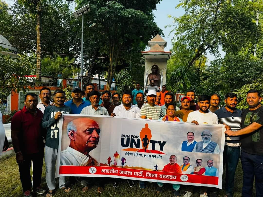 बहराइच। भारतीय जनता पार्टी के जिला अध्यक्ष बृजेश पांडे की अध्यक्षता में रन फॉर यूनिटी का कार्यक्रम सरदार वल्लभ भाई पटेल के जयंती के 1 दिन पूर्व मनाया गया। यह कार्यक्रम 2014 से निरंतर मनाया जा रहा है। इसी क्रम में आज पानी टंकी चौराहा पर भारतीय जनता पार्टी के सभी कार्यकर्ताओं का एकत्रित करण करके एक मैराथन दौड़ शहीद उद्यान तक की गई। तत्पश्चात सरदार वल्लभभाई पटेल के प्रतिमा व सभी महापुरुषों के प्रतिमा पर माल्यार्पण का कार्यक्रम संपन्न करके कार्यक्रम का समापन किया गया। इस अवसर पर जिला अध्यक्ष भाजपा बृजेश पांडे विधान परिषद सदस्य डॉक्टर प्रज्ञा त्रिपाठी जिला उपाध्यक्ष रण विजय सिंह जिला महामंत्री नन्हेंलाल लोधी मनीष आर्य जिला मंत्री हेमा निगम राजन सिंह जिला मीडिया प्रभारी देवेंद्र कुमार मिश्रा अरुणेन्द्र सिंह अंकित नितिन रूपानी कृष्ण कुमार मिश्रा नगर मंडल अध्यक्ष प्रथम अमित शर्मा सतीश सिंह प्रभात शुक्ला पंकज केवट शिवांकर शुक्ला आशीष त्रिवेदी अमित वर्मा अजीत पांडे आलोक सिंह अयोध्या प्रसाद अवस्थी रवि प्रताप सिंह मिथुन वर्मा आदि सैकडो कार्यकर्ता उपस्थित रहे।