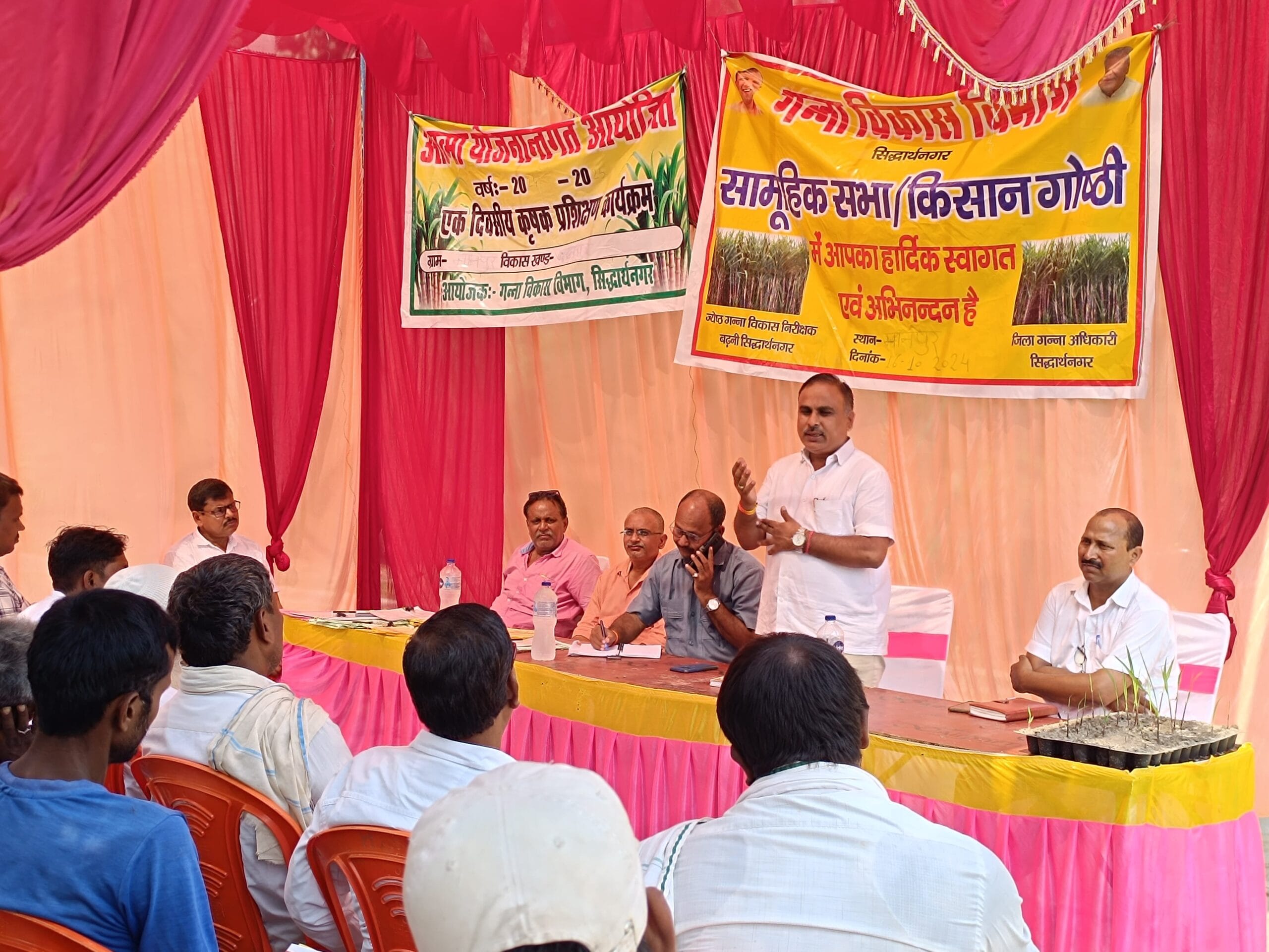 बढ़नी – सिद्धार्थ नगर जनपद के बढ़नी परिक्षेत्र में शरद कालीन गन्ने की वैज्ञानिक खेती के प्रति कृषकों को जागरूक करने के लिए अप्रवैधिक गन्ना विकास कमेटी द्वारा ग्राम मानपुर में शरद कालीन गन्ना विकास गोष्ठी का आयोजन किया गया । जिसकी अध्यक्षता प्रगतिशील किसान श्री राज नारायण पांडे ने किया। इस अवसर पर गन्ना कमेटी के ज्येष्ठ गन्ना विकास निरीक्षक ने बताया कि गन्ने की अधिक उपज देने वाली प्रमुख प्रजातियां को शा० 17231 को०शा० 13235, को० 118, को लक० 14201, को० 98014, को० शा०8279 आदि की बुवाई ट्रेन्च विधि से करें। गन्ने की दो पंक्तियों के बीच खाली स्थान में प्याज की चार पंक्तियों की रोपाई करें। प्याज बोने से गन्ने का औसत उपज बढ़ेगा तथा सबसे हानिकारक कीट अंकुर बेधक का नियंत्रण होगा। एक एकड़ गन्ने में 80 से 90 कुंतल प्याज होगा लगभग एक लाख रुपए का। इससे किसानों की आय बढ़ेगी। किसानों को सहफसली खेती का फोटोग्राफ दिखाकर समझाया भी गया।…गन्ना पर्यवेक्षक रवि प्रकाश चौधरी ने बताया कि आधार गन्ना पौधशाला से बीज गन्ना वितरण पर पचास रुपए प्रति कुंतल और प्राथमिक पौधशाला से पच्चीस रूपये प्रति कुंटल अनुदान दिया जाता है.उन्होंने विभाग द्वारा संचालित सभी योजनाओं को विस्तार से बताया।यह भी बताया कि शरद कालीन बुवाई हेतु विभाग में सभी अगेती प्रजातियों के बीज उपलब्ध है, जिसकी बुकिंग शुरू है इच्छुक कृषक अपने क्षेत्र से संबंधित गन्ना पर्यवेक्षक से संपर्क कर सकते हैं।तुलसीपुर चीनी मिल के गन्ना प्रबंधक चंद्र शेखर सिंह ने बताया कि गन्ने की खेती में उत्पादन लागत कम करने के लिए कृषि यंत्रों पर अनुदान दिया जा रहा है। बीपेन्द्र सिंह ने बताया कि बीज व भूमि उपचार के लिए हेक्सास्टॉप तथा ट्राईकोडर्मा अनुदान पर दिया जा रहा है। को० 15023 गन्ना प्रजाति जल भराव वाले क्षेत्रों में न बोयें। गन्ना पर्यवेक्षक श्रीअशोक कुमार चतुर्वेदी द्वारा राष्ट्रीय कृषि विकास योजना तथा जिला योजनाओं के बिषय में बताया।किसान इंद्रजीत चौधरी ने ट्रेन्च विधि से लाभ के बारे में बताया। गोष्ठी में गन्ना पर्यवेक्षक शेष नारायण द्विवेदी, रवि त्रिपाठी,राजेश सिंह..अशोक सिंह और चीनी मिल स्टाफ मुकेश यादव भी मौजूद रहें.गोष्ठी में फैजान, वेद प्रसाद, कैलाश चौधरी,रफीउल्लआह , सफातुल्लाह, इन्द्र जीत चौधरी,रिंकू चौधरी,मिठाई लाल, अब्दुल रऊफ, संतोष चौधरी समेत अनेक किसान मौजूद रहे।