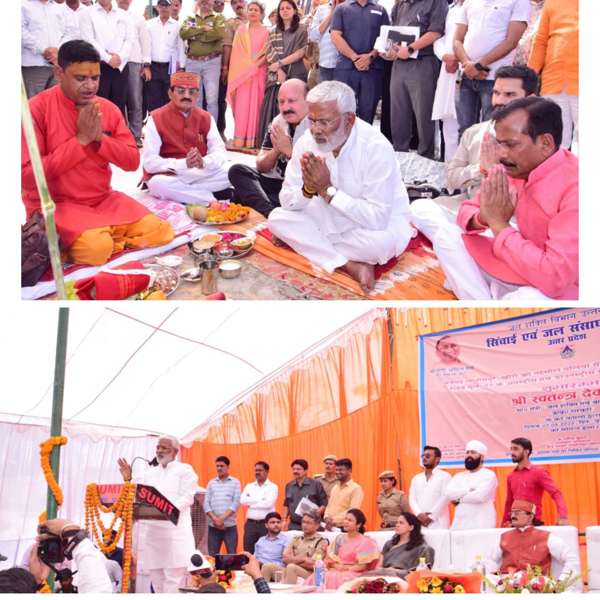 लखीमपुर खीरी – जनपद लखीमपुर खीरी के तहसील पलिया में शारदा नदी स्थान पर जल शक्ति मंत्री स्वतंत्र देव सिंह पहुंचकर जनप्रतिनिधियों – अफसरों संग शारदा नदी पर निर्मित पलिया में शारदा नदी पर निर्मित रेलवे पुल -97 के अपस्ट्रीम एवं डाउनस्ट्रीम चैनेलाइजेशन में सात किलोमीटर तक ड्रेजिंग का बजट₹22.23 करोड़ की लागत से होने वाले कार्य का पूरे विधि विधान से भूमि पूजन किया। और 48 परियोजनाओं का लोकार्पण, 20 परियोजनाओं का शिलान्यास भी किया। मंत्री ने नदी तट पर फीता काटकर कार्य का शुभारंभ किया। इस मौके पर मुख्य रूप से पलिया 137 विधानसभा विधायक रोमी साहनी, योगेश वर्मा, अमन गिरी, विनोद शंकर अवस्थी, बीजेपी जिलाध्यक्ष सुनील सिंह, आयुक्त डॉ० रोशन जैकब, डीएम दुर्गा शक्ति नागपाल, एसपी संकल्प शर्मा, सीडीओ अभिषेक कुमार, मुख्य अभियन्ता स्तर – 1, रूहेलखण्ड, सिंचाई एवं जल संसाधन बरेली महेश्वरी प्रसाद मुख्य, अभियंता (शारदा संगठन), बरेली एच० एन० सिंह , अधीक्षक अभियंता, बाढ़ मण्डल धर्मेंद्र कुमार, अधिशासी अभियंता, बाढ़ खण्ड, शारदानगर अजय कुमार सहित कई और प्रशासनिक अफसर मौजूद रहे।