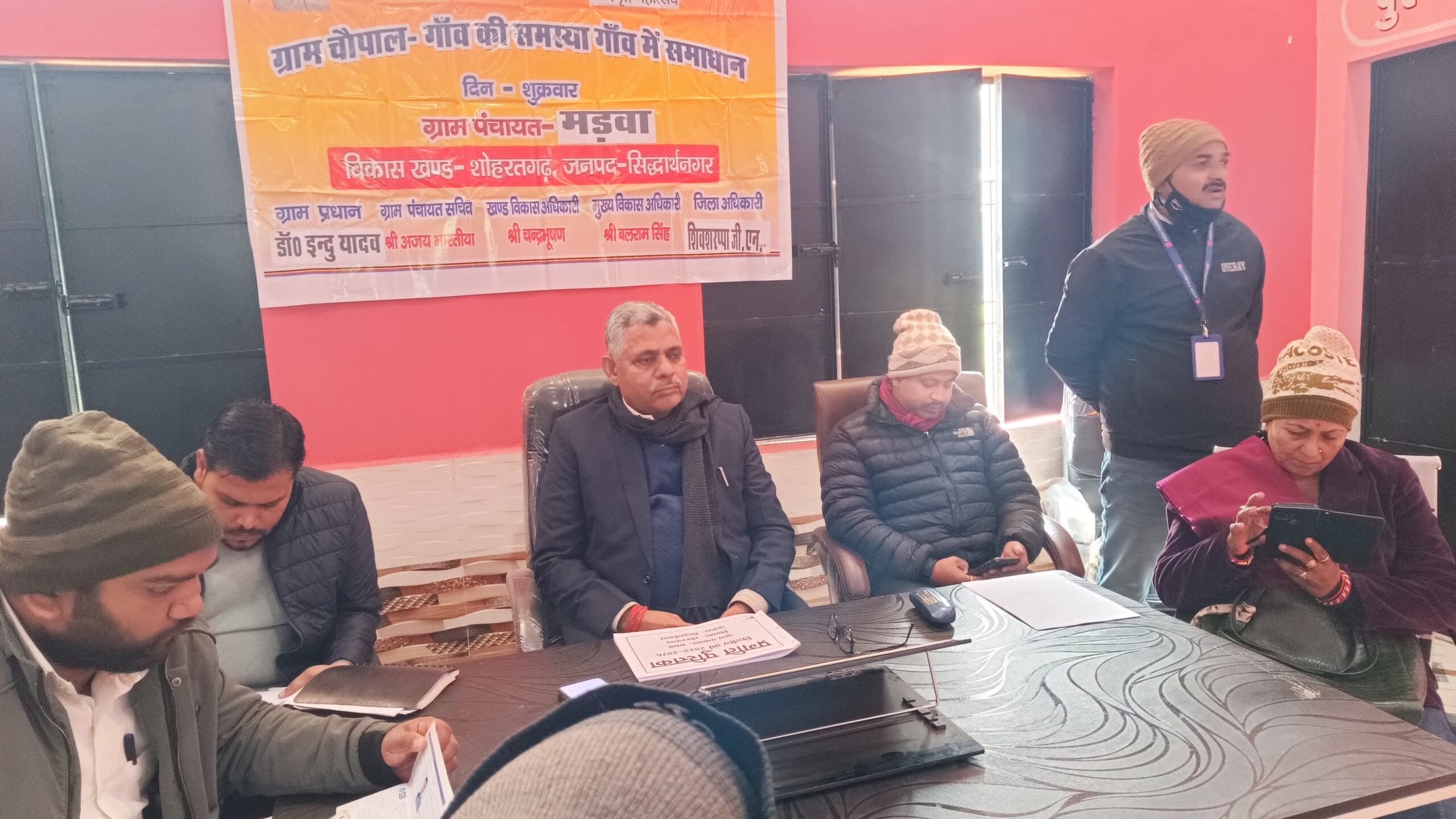मड़वा गांव की चौपाल कार्यक्रम की अध्यक्षता खण्ड विकास अधिकारी शोहरतगढ़ चन्द्रभूषण तिवारी ने की। चौपाल में ग्रामीणों ने पेंशन, प्रधानमंत्री आवास योजना, व्यक्तिगत शौचालय, रोजगार, स्वच्छता सहित अन्य जनकल्याणकारी योजनाओं से जुड़ी समस्याएं अधिकारियों के समक्ष रखीं।कार्यक्रम में अधिकारियों द्वारा जी राम जी योजना (विकसित भारत–गारंटी फॉर रोजगार एंड आजीविका मिशन ग्रामीण), पीएम आवास, पेंशन, शौचालय, रोजगार से संबंधित योजनाओं की जानकारी दी गई तथा ग्रामीणों को स्वच्छता के प्रति जागरूक किया गया।