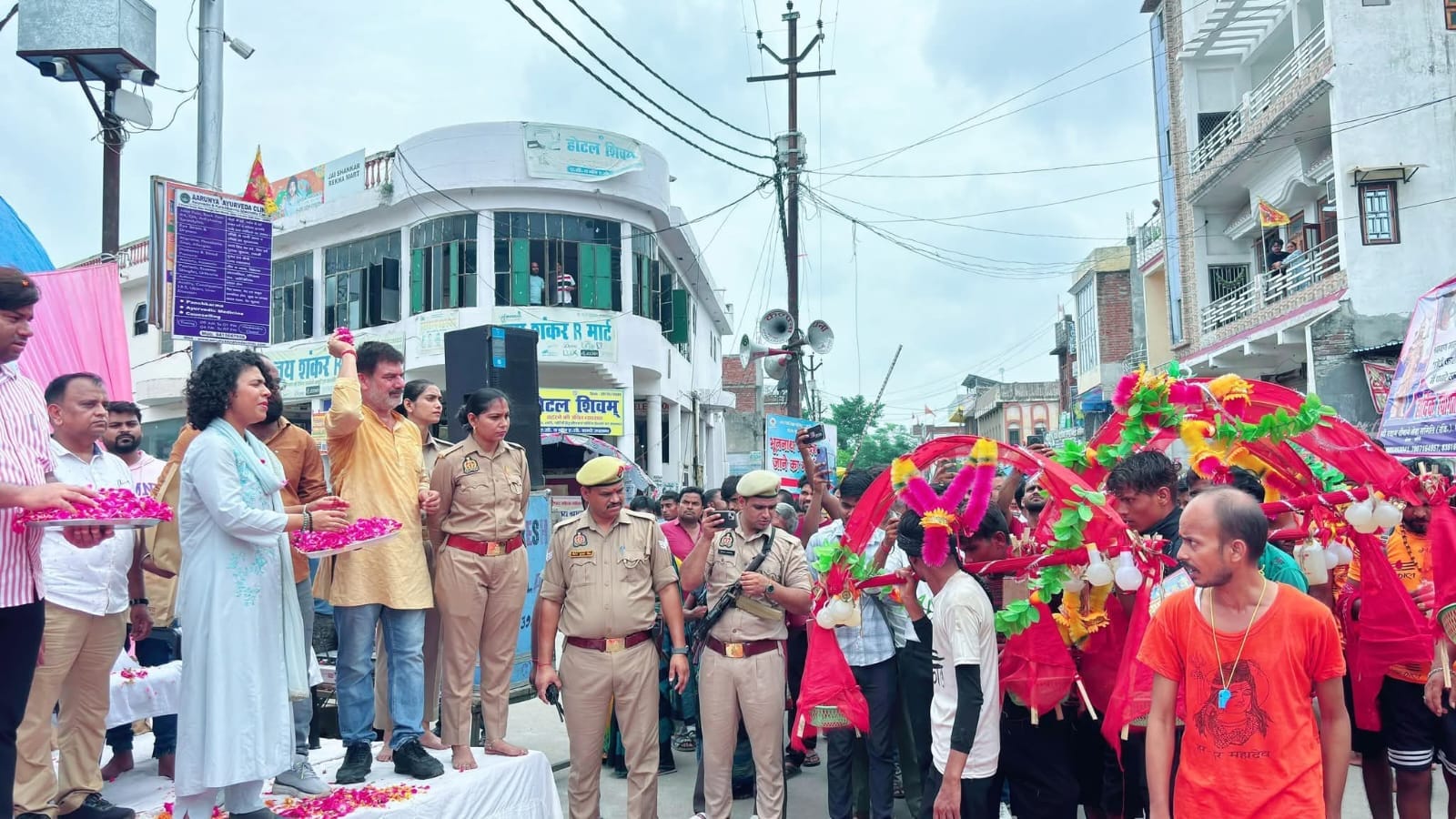 फूलों की बारिश में नहाए कांवड़िए शिवम् तिराहा पर बनाए गए मंच से जैसे ही डीएम दुर्गा शक्ति नागपाल ने दोनों हाथों से फूलों की वर्षा की, पलकें नम हो गईं, चेहरों पर भक्ति मुस्काई और श्रद्धा ने मानो आकार ले लिया। नगर पालिका परिषद गोला विजय शुक्ला रिंकू, विधायक प्रतिनिधि मोंटू गिरी, एडीएम नरेंद्र बहादुर सिंह ने भी उनके साथ मिलकर श्रद्धालुओं पर पुष्पवर्षा की।