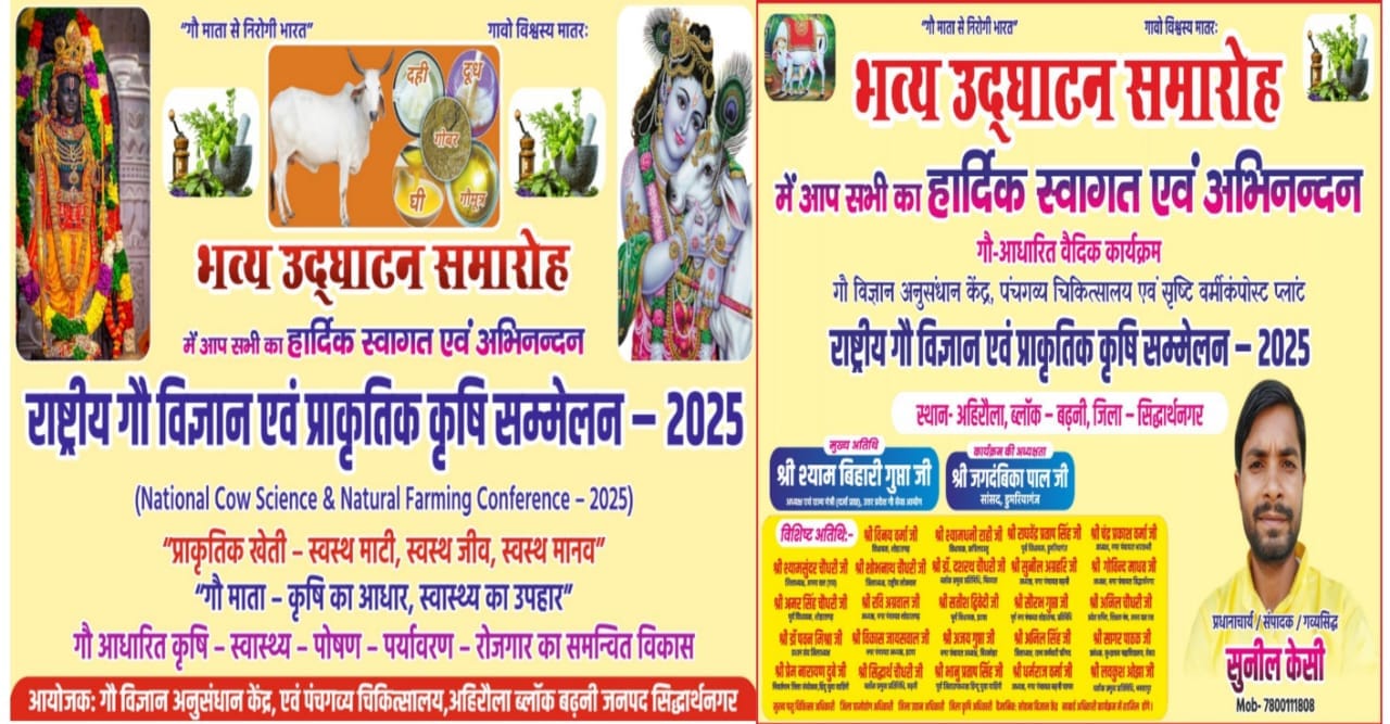 बढ़नी- गौ विज्ञान अनुसंधान केंद्र एवं पंचगव्य चिकित्सालय का भव्य उदघाटन समारोह 6 दिसंबर 2025 दिन शनिवार को होगा । जिसके मुख्य अतिथि गौ सेवा आयोग़ अध्यक्ष एवं राज्य मंत्री श्री श्याम बिहारी गुप्ता होंगे। कार्यक्रम की अध्यक्षता डुमरियागंज सांसद जगदंबिका पाल करेंगे।