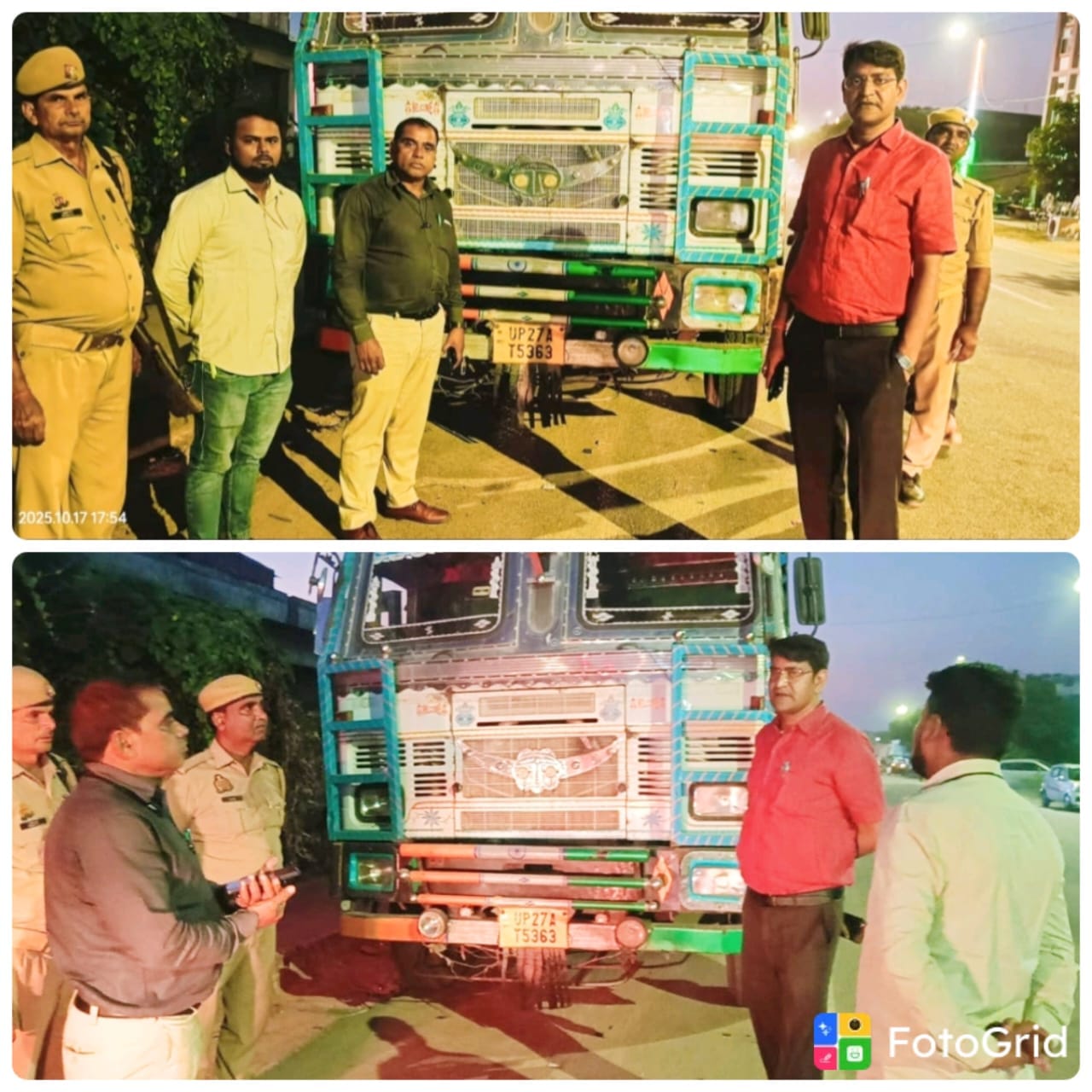 शोहरतगढ/बढ़नी शोहरतगढ़ विवेकानन्द मिश्रा की अगुवाई में मण्डी समिति कर्मचारियों की टीम ने शुक्रवार देर सायं एक ट्रक संख्या-UP27 AT 5363 को अवैध रूप से करीब 400 बोरा , में लगभग 240 कुन्तल गेहूं ले जाते हुए पकड़ा, क्योंकि चालक के पास गेहूं से सम्बन्धित कोई वैध कागजात नहीं थे। यह कार्रवाई गेहूं की कालाबाजारी रोकने के लिए की गई है, और ट्रक को जब्त कर आगे की कार्रवाई की जा रही है। आप फोटो में देख सकते हैं जो मण्डी समिति द्वारा अवैध परिवहन करते हुए ट्रक को पकड़ने की घटना को दिखाता है। आपको बता दें कि एसडीएम के साथ मण्डी समिति कर्मचारियों की टीम ने एनएच-730 के महथा बाजार मोड़ के समीप एक ट्रक को रोका, जिसके बाद जांच में पता चला कि उसमें गेहूं लदा हुआ था। वहीं पूछ-ताछ में चालक के पास गेहूं के परिवहन से सम्बन्धित कोई वैध कागजात नहीं थे और यह कालाबाजारी का मामला माना जा रहा है। जिसको लेकर ट्रक को जब्त कर तहसील शोहरतगढ़़ प्रांगण में खड़ा कर दिया गया है और चालक के खिलाफ आवश्यक कानूनी कार्रवाई की जायेगी। वहीं गेहूं लदे ट्रक पर 90 हजार रुपये जुर्माना लगाया है। इस सम्बन्ध में एसडीएम शोहरतगढ़ विवेकानन्द मिश्रा ने बताया कि इस तरह की कार्रवाई का उद्देश्य गेहूं की कालाबाजारी को रोकना और सरकारी क्रय केन्द्रों के बाद भी हो रही धोखाधड़ी पर अंकुश लगाना है। उक्त कार्रवाई के दौरान एसडीएम विवेकानन्द मिश्रा, मण्डी सहायक सुरेन्द्र कुमार कन्नौजिया, कम्प्यूटर आपरेटर नफीस आलम सहित अन्य लोग मौजूद रहें।