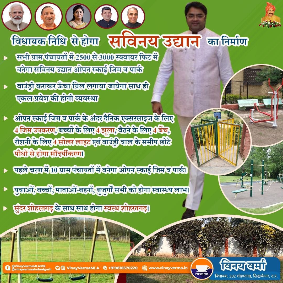 लसियापुर। शोहरतगढ़ के विधायक विनय वर्मा ने प्रेस विज्ञप्ति जारी कर बताया कि विधायक निधि से विधानसभा क्षेत्र के 10 गांवों में ओपन जिम बनवाने के लिए 225.42 लाख रुपये अवमुक्त कर दिए हैं। इन गांवों में ओपेन जिम बनने से सभी वर्गों के ग्रामीणों को इसका लाभ मिलेगा। विधायक ने बताया कि एक ओपन स्काई जिम व पार्क के अंदर दैनिक एक्सरसाइज के लिए 4 जिम उपकरण, बच्चों के लिए 4 झूला, बैठने के लिए 4 बेंच, रोशनी के लिए 4 सोलर लाइट एवं चहारदीवारी के पास छोटे पौधों का रोपण कराकर सुंदरीकरण कराया जाएगा।